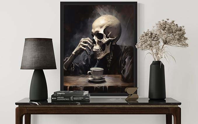 Skull Drinking Coffee Poster Art Print, Halloween Scary Vintage Wall Art Academia Spooky Painting Decoration for Horror Prints, Gothic Posters Bedroom Decor 89 (Skull Drinking Coffee, 11 x 14 inches, Unframed)