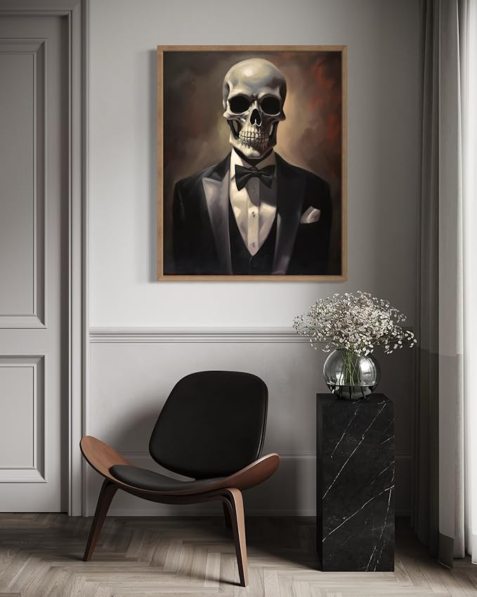 Skull Portrait Poster Art Print, Halloween Scary Vintage Wall Art Academia Spooky Painting Decoration for Horror Prints, Gothic Posters Bedroom Decor 89 (Skull Portrait, 16 x 20 inches, Wood Frame)