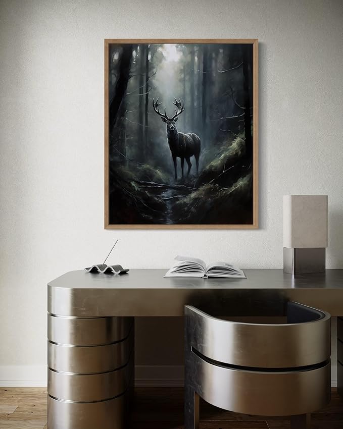 Deer in Forest Poster Art Print, Halloween Scary Vintage Wall Art Academia Spooky Painting Decoration for Horror Prints, Gothic Posters Bedroom Decor 89 (Deer in Forest, 8 x 10 inches, Wood Frame)
