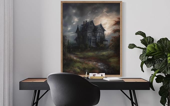 Haunted House Poster Art Print, Halloween Scary Vintage Wall Art Academia Spooky Painting Decoration for Horror Prints, Gothic Posters Bedroom Decor 89 (Haunted House, 16 x 20 inches, Wood Frame)