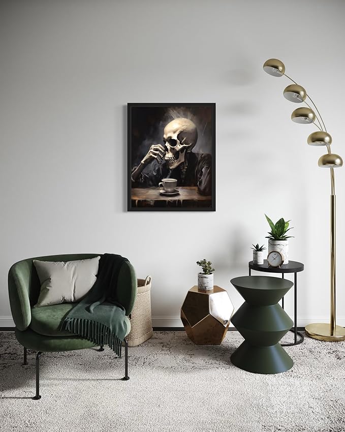 Skull Drinking Coffee Poster Art Print, Halloween Scary Vintage Wall Art Academia Spooky Painting Decoration for Horror Prints, Gothic Posters Bedroom Decor 89 (Skull Drinking Coffee, 8 x 10 inches, Black Frame)