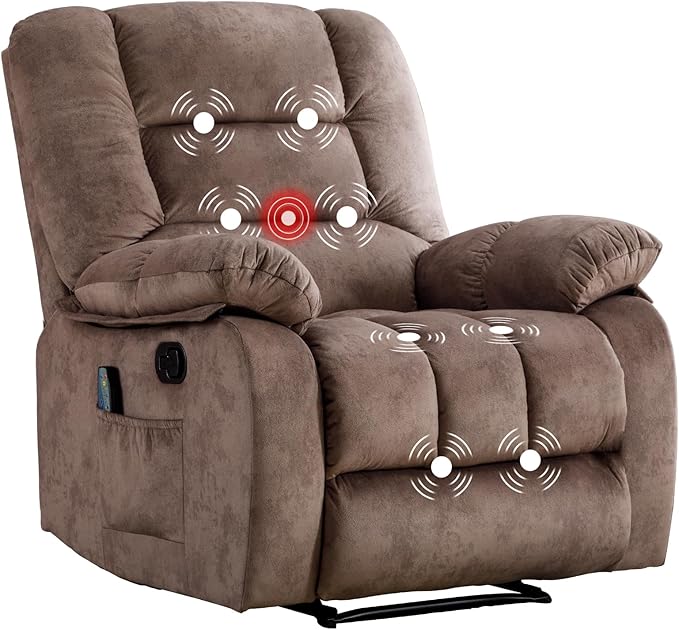 - completely. 【Massage & Lumbar Heating】Relax in comfort with 8-point massage functionality and lumbar heating. This recliner targets key areas for your back, lumbar, thighs and legs to improve blood circulation, relieve tension, and reduce fatigue. Choose from 3 massage modes and adjustable intensity levels to customize your relaxation. The built-in timer lets you set 15, 30, or 60-minute massage sessions for convenience.