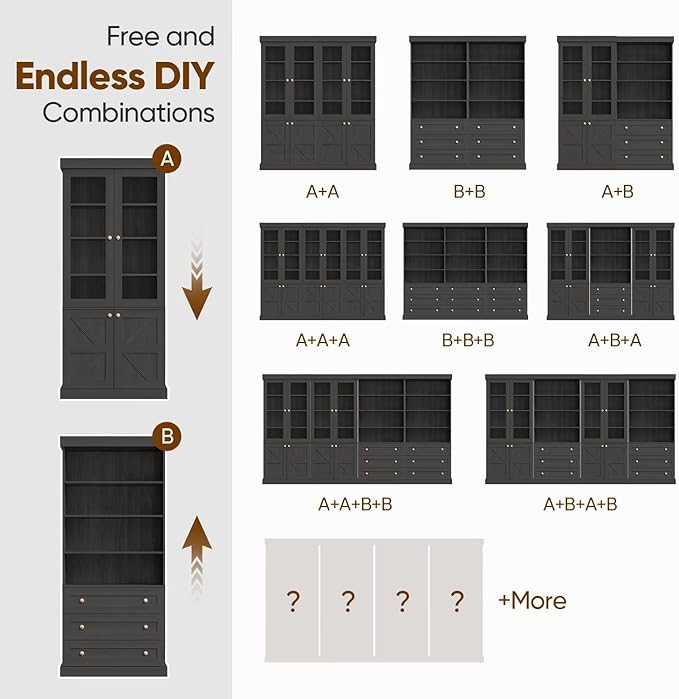 - 【Farmhouse Bookcase】 This farmhouse-style bookcase blends rustic charm with modern functionality. Featuring a classic barn-style design, it is available with glass doors or drawers to suit your storage needs. The natural wood tones and X-shaped accents bring timeless appeal, enhancing the style of any room.