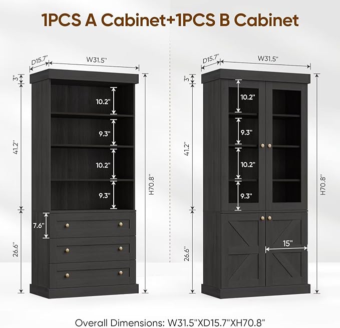 - 【Ample Storage with Adjustable Shelves】 Measuring 31.5"W x 15.7"D x 70"H, this bookcase offers adjustable shelves, a spacious bottom compartment, and your choice of glass doors or drawers. It’s perfect for storing books, decor, and everyday essentials, blending functionality with elegance.