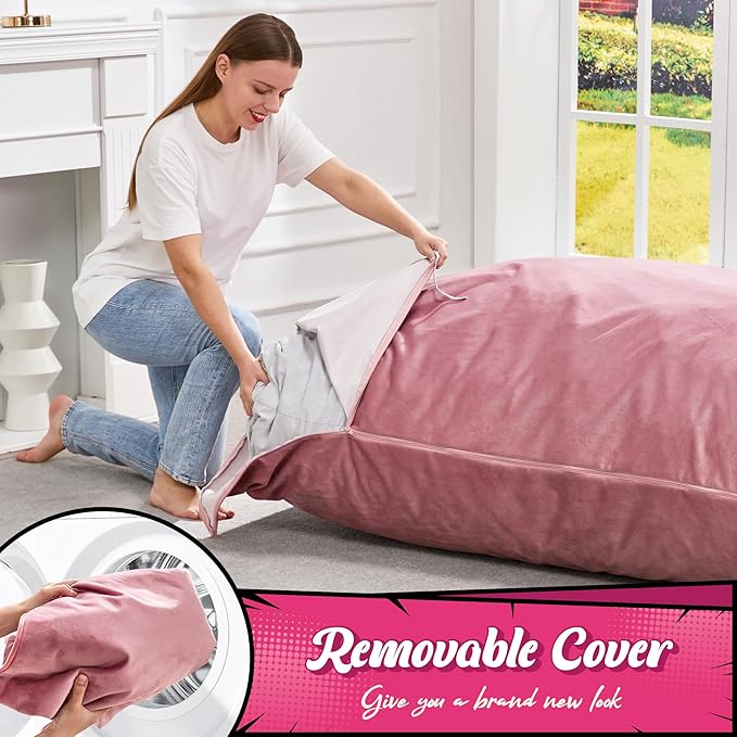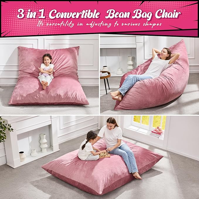 Hobestluk 3 in 1 Bean Bag Chair Giant Bean Bag Chairs for Adults with Velvet Cover Convertible Bean Bag Floor Cushion with Machine Washable Cover for Living Room (Velvet Pink)