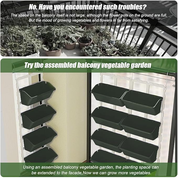 - 【Customizable Planting Vertical Rack】You can customize the horizontal or vertical patchwork product, which in turn adapts to your balcony, creating a planned planting scene. Eight pots can be easily categorized for different crops to meet your planting needs. Additionally, This 4-tier hanging planter rack protects facades from weather damage and corrosion, keeps them cooler in the summer and warmer in the winter.