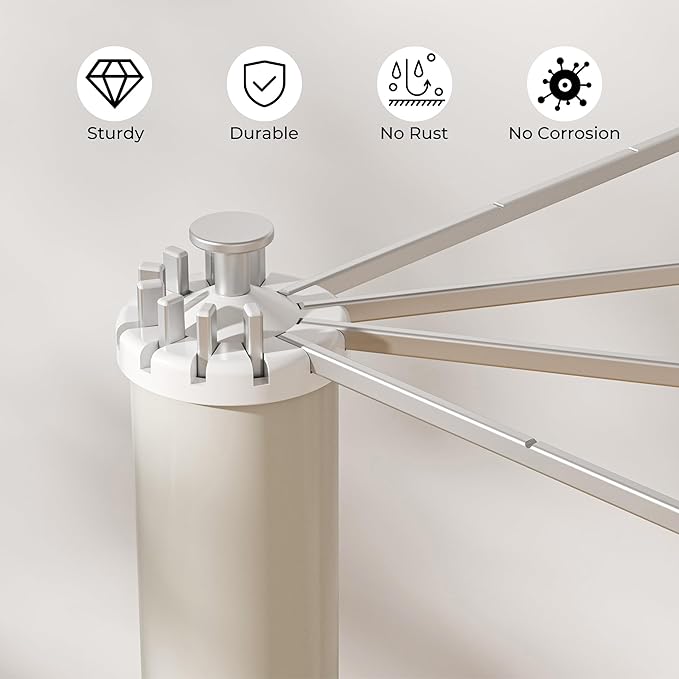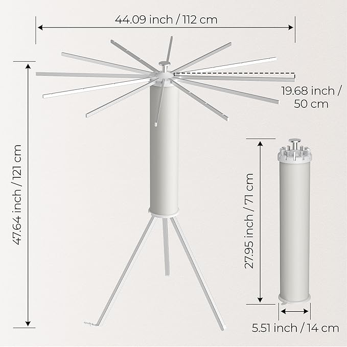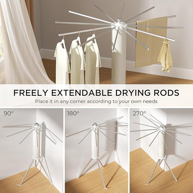 - 【Sturdy and Durable】The clothes drying rack has 12 rods and a strong tripod structure that can support up to 35 pounds of clothing; Depending on your needs for space and usage needs, you can increase the number of arms you require.The folding drying rack's unique tripod design allows it to remain perfectly stable in a limited area.