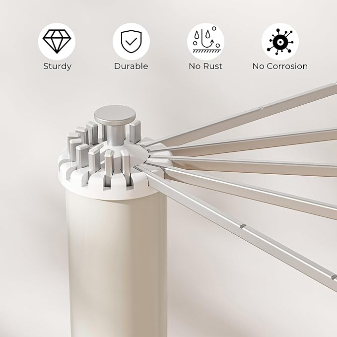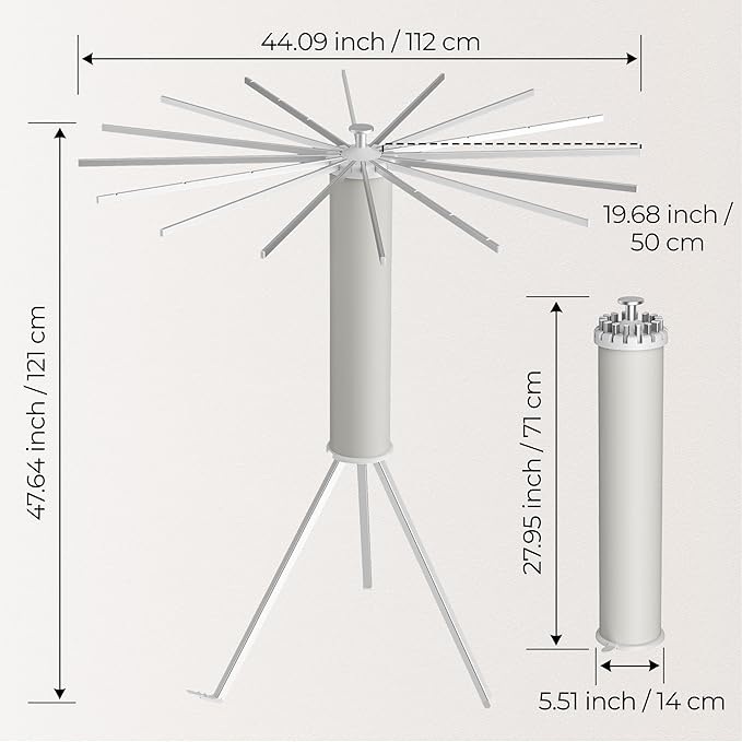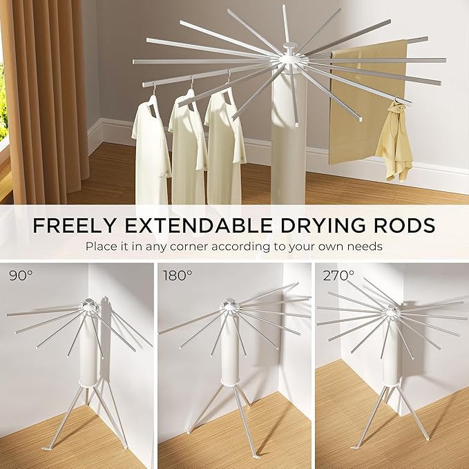 - 【Sturdy and Durable】The clothes drying rack has 16 rods and a strong tripod structure that can support up to 45 pounds of clothing; Depending on your needs for space and usage needs, you can increase the number of arms you require.The folding drying rack's unique tripod design allows it to remain perfectly stable in a limited area.