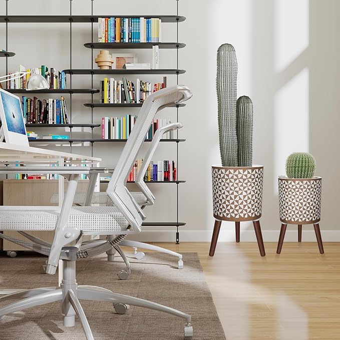 - 【Elegant 3D Pinwheel Design】This planter features a captivating 3D pinwheel pattern in a chic combination of white and gold, perfectly complemented by three sturdy coffee-colored wooden legs. Its unique and eye-catching design adds a modern yet luxurious touch, making it a versatile addition to various decor styles, including contemporary, glam, and mid-century. Ideal for showcasing your favorite plants while elevating the aesthetic of any room.
