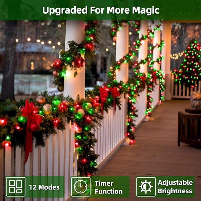 - Perfect Size for Everyday Decorating: At 75ft with 300 LEDs in red and green, these Christmas string lights fill your home with a warm, festive glow. The perfect length for balconies, porches, stair railings, mantels, or a 7–9ft Christmas tree. Not too long, not too short—ideal for cozy holiday nights. Connect up to 3 sets (225ft, 900 LEDs total) to bring bold Christmas spirit to fences, patios, or the housefront.
