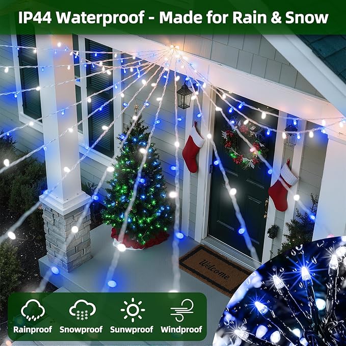 - Outdoor Waterproof: Winter weather won’t ruin your holiday spirit. These waterproof holiday lights lights handle rain, snow, frost, and sleet with ease. The outdoor Christmas lights blends naturally with trees, garlands, and wreaths, leaving only the glow. Perfect for rooftops, fences, porches, or balconies, they keep your home shining through the entire season. From Christmas decorations and New Year’s Eve parties to summer BBQs, these fairy lights deliver year-round sparkle