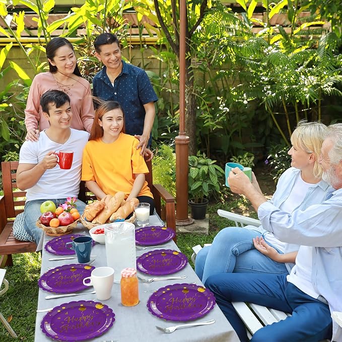 - 【EXQUISITE DESIGN】:Eye-catching gold foil stamping of 'Happy Birthday' in stylish fonts adorns these purple dessert plates and the rising balloon signifies growing goodness. It adds a touch of elegance and festivity, making your birthday party table instantly stand out.