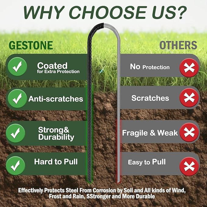 - STRONGER ANCHORS:GESTONE 16 inch heavy duty tent stakes are designed to prevent the large trampoline tent from overturning or shifting during use. Ground stakes heavy duty are ideal as fence stakes for wire fencing,metal fence stakes,to prevent your lovely dogs pushing the chain link fence out and escaping.