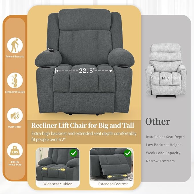Oversize Power Lift Recliner Chair for Big and Tall with Extended Footrest, Large Electric Lift Chairs, 400lbs Capacity, Remote Control, Cup Holders & Side Pockets