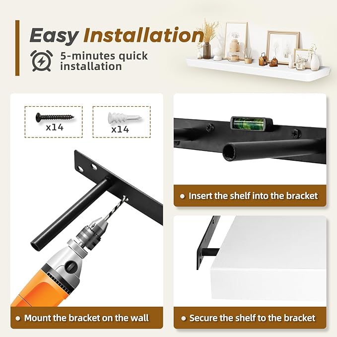 - Hidden Bracket Installation: Includes secure hidden steel brackets for a clean floating look. These easy-to-install shelves provide stability and a sleek, minimalist appearance