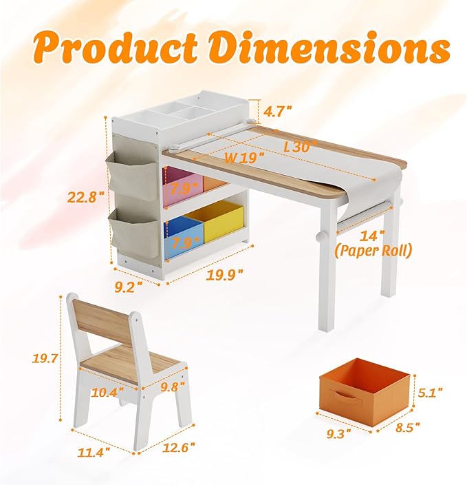 - Multi-Function Table Set: IKALIFE kids art table and chair set includes an activity table and 2 chairs, a paper roll and 4 fabric bins and a double side fabric pocket. This toddler activity table offers more storage space while also serving as a painting table, desk or game table. Suitable for Ideal for a variety of settings such as children's rooms, playrooms, daycare or classrooms.