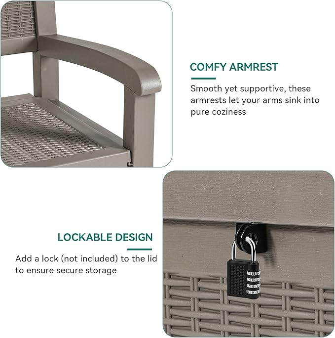 - Lockable Security: Our outdoor bench storage keeps your treasures safe with a lockable design (padlock not included); Stash your pool deck storage essentials or porch items and enjoy peace of mind, knowing everything's secure while you're away
