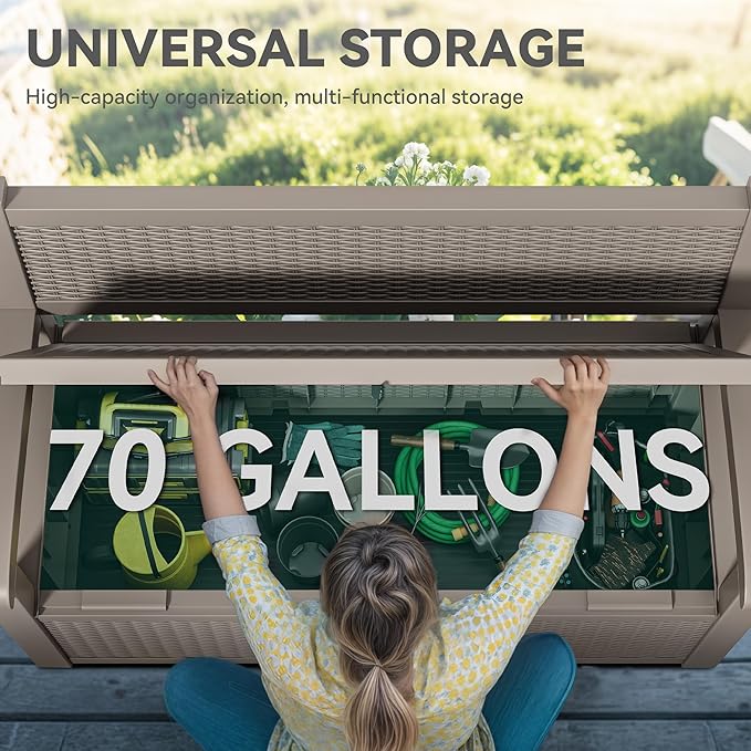 - Massive Hidden Storage: Unlock 70 gallons of extra space beneath this deck box bench, measuring 46.6''L x 17.4''W x 12.9''H inside (51.06''L x 24.2''W x 35.2''H outside); It's ideal for stashing patio cushions, gardening tools, or pool accessories