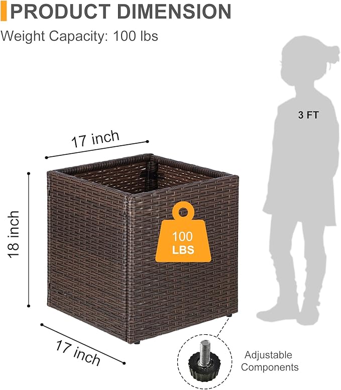 - Product Details - Dimensions (LxWxH) Plant pot: 17 x 17 x 18 inch Material: PE rattan, Powder-coated Steel, Plastic , Adjustable Feet