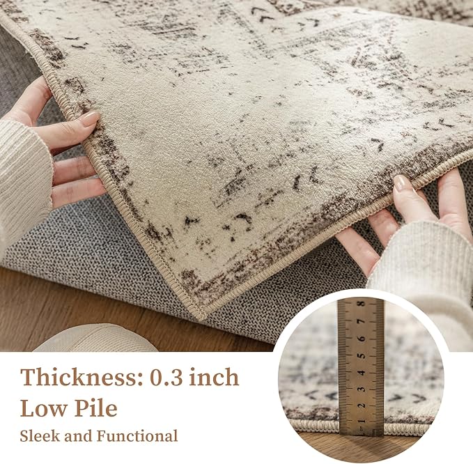 5'x7' Area Rug - Vintage Persian Medallion Design Low-Pile Faux Wool Rug, Non-Slip Backing, Machine Washable, for Living Room, Dining Room, Bedroom (Cream/Taupe)