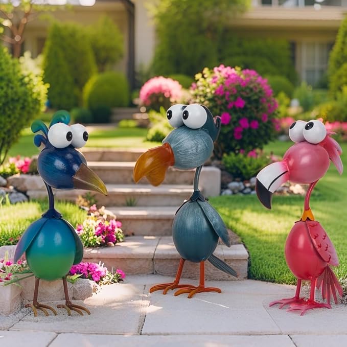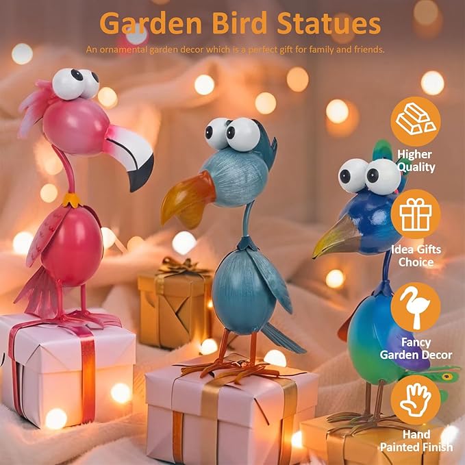- Exquisite Art: Three birds are respectively 4.8 x 3.2 x 7.8 inches for pelicans, 5.9 x 3.5 x 7.8 inches for peacocks, and 5.2 x 3.3 x 7.8 inches for flamingos. The combination of high-quality iron sheets and vivid and cute image design fills your garden statue with interesting details and bold imagination.