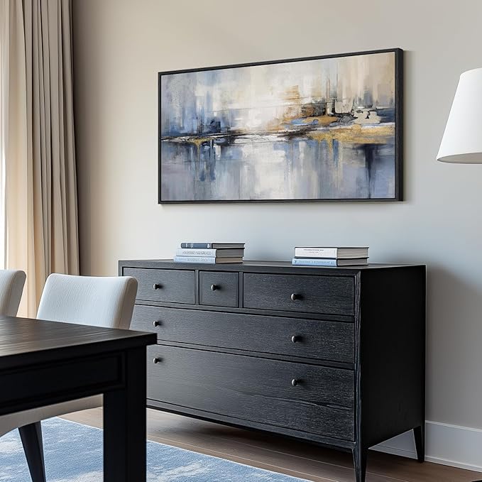 - [Framed Wall Art]: One piece large framed blue and gold abstract canvas wall art, crafted with a sturdy solid wood frame for enhanced durability and a refined look. The large horizontal size of 28.5x57 inches makes it a stunning centerpiece for any wall