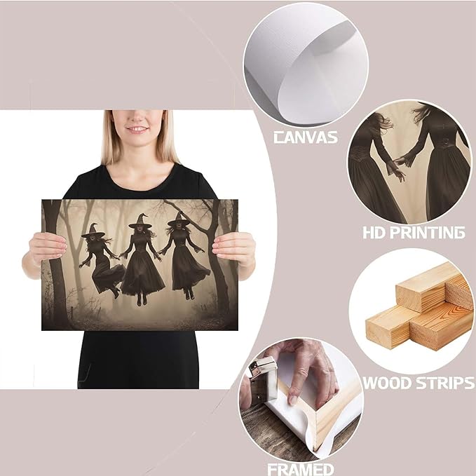 Three ghost witches flying in vintage forest gothic wall art witchcraft decoration holiday gift canvas wall art print12x16in Wood Framed