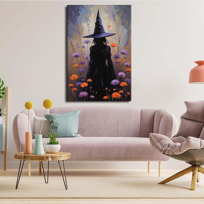 Country wildflower witch canvas print halloween mashup art witch purple decoration bohemian elegant art poster12x16in Wood Framed