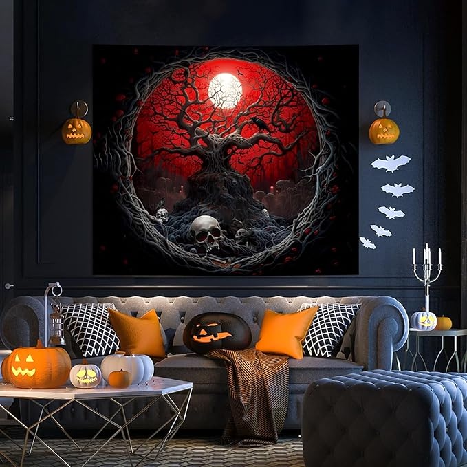 Atrippy Halloween Black Red Anime Tapestry, Gothic Dark Forest Moon Wall Hanging, Nature Skull Withered Tree Landscape Tapestries for Bedroom Living Room Men Dorm 60x 79 Inches