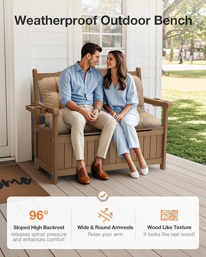 - Strong and Resistant: The garden benches for outdoors with storage is made of upgraded HIPS eco-friendly material. Fade-resistant, waterproof, resistant to cracking, peeling, and decay, lasting longer than wood or metal bench. The porch bench can withstand harsh weather conditions in any season. Our poly outdoor bench can be used for more than 10 years and save money.