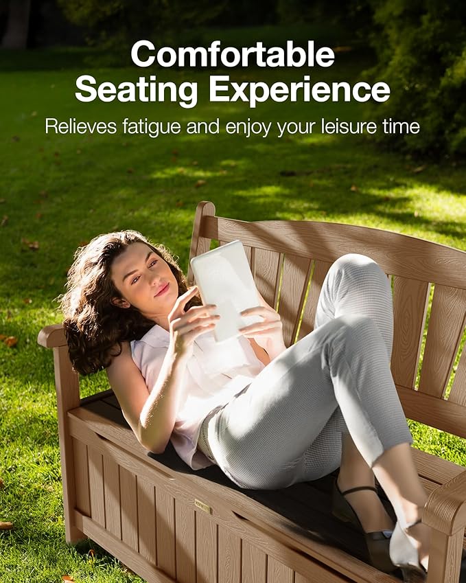 - 2-Person Outdoor Bench Storage: With spacious dimensions of 37.4" W x 23.2" D x 56.3" H and 800 lbs Weight Capacity. The patio park bench is perfect for garden, porch, backyard, fire pit, balcony, lawn, outside, poolside, indoor, beach, or deck, offering a tranquil space to relax and enjoy nature with your friends or family. It also could serve as a storage deck box for patio cushions, toys, pool towels, gardening tools, and so on.