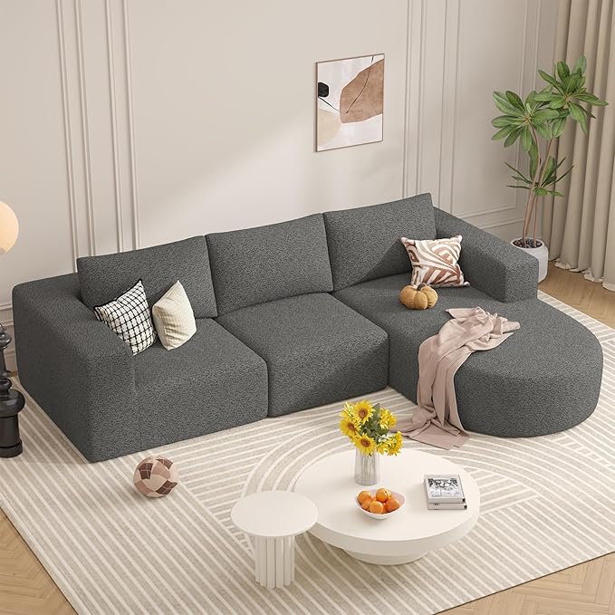 - L-SHAPE MODULAR SOFA: "Maximize Space with Style".This modular sectional sofa features a sleek L-shaped design that fits perfectly against walls, optimizing your living room sofa setup. Its unique curved sofa structure adds a touch of sophistication that sets your space apart.