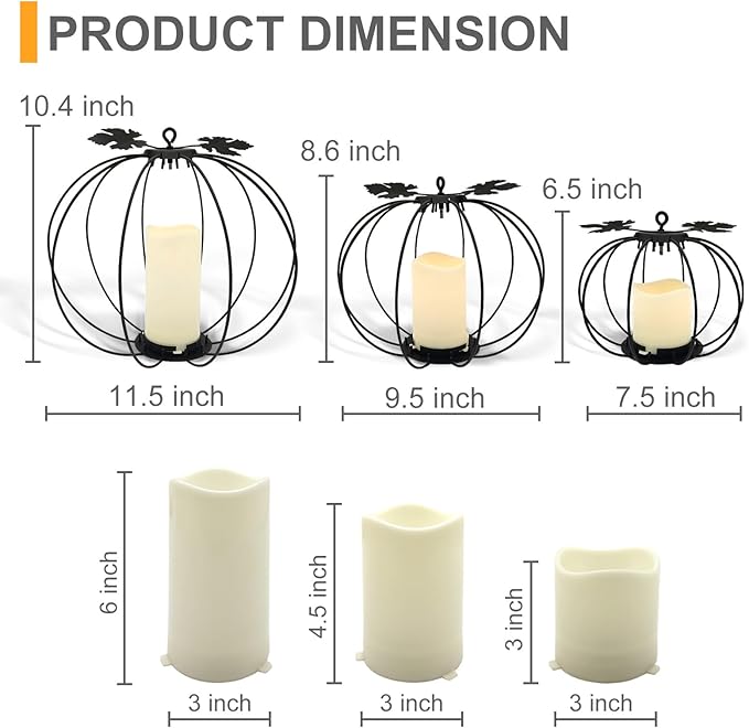 - Material & Dimension: These pumpkins are crafted with durable metal which makes it possible to keep long-lasting performance. The pumpkins measure 11.5" Diam. x 10.4"H; 9.5"Diam. x 8.6"H; 7.5"Diam. x 6.5"H, and the candle lights measure 6”H; 4.5”H; 3”H