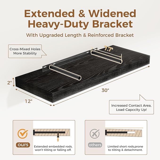 Fun Memories 30 Inch Floating Shelves Black, 12 Inch Deep Floating Shelf for Books, 30 x 12 x 2 Deep & Thicked Wall Shelves for Bathroom, Living Room, Kitchen, Set of 1