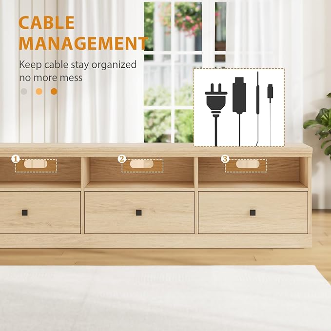 - CABLE MANAGEMENT: This entertainment stand features 3 metal handles for a sophisticated touch. The drawers open smoothly and quietly for easy access, keeping your space organized and clutter-free. With 3 cable holes at the back, this tv entertainment center effectively conceals cables for a tidy, streamlined appearance