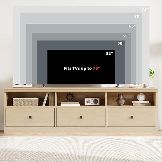 - DIMENSIONS & STORAGE: This tv cabinet measures 70” L x 15.4” W x 20.5” H and accommodates flat or curved TVs up to 75 inches. The tv console table provides ample storage space with a combination of open shelves for decor and media devices, plus drawers to neatly stow away remotes, cables, and other essentials