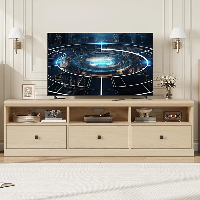 IDEALHOUSE 70in TV Stand for TVs up to 80", Mid Century Modern Entertainment Center with Storage Drawer and Open Shelves, TV Console Media Cabinet for Living Room, Bedroom (Light Oak)