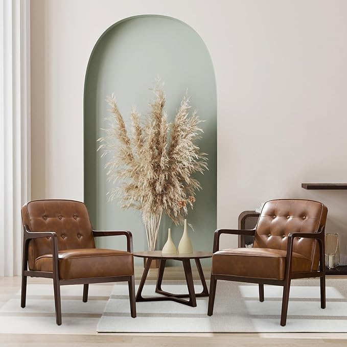 Faux Leather Accent Chair Set of 2, Mid Century Chair for Living Room, Upholstered Comfy Lounge Armchair with Solid Wood Frame, Modern Chair for Bedroom,105°Ergonomic Comfort, Brown