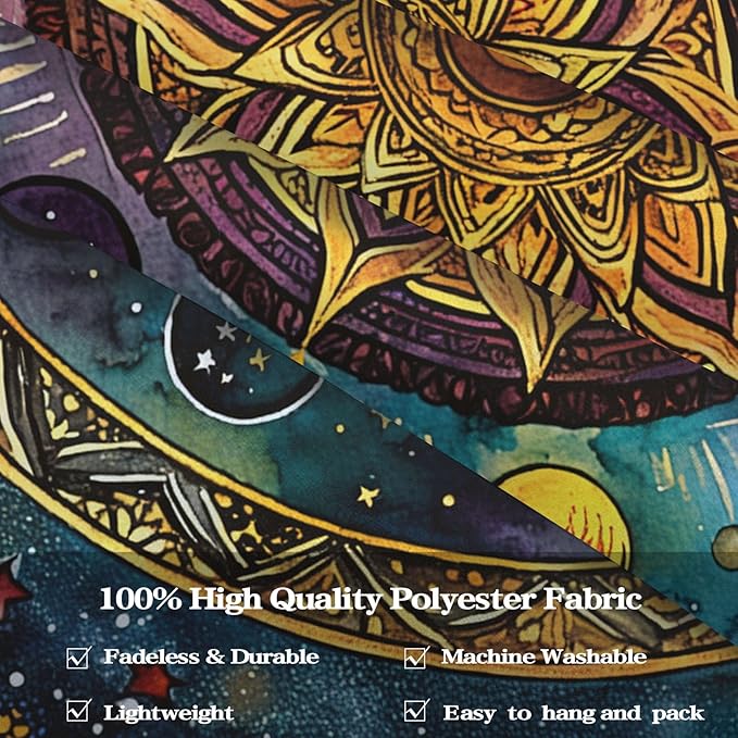 - Unique Mandala Solar System Design: This Lunerfex tapestry features a vibrant mandala design surrounded by cosmic elements, including planets, stars, and the moon, creating a mystical atmosphere in your home.