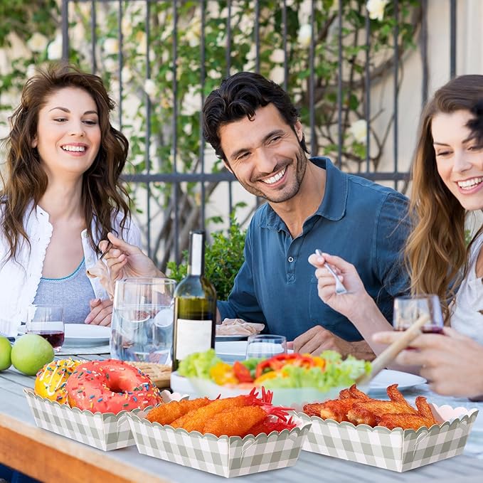 48 Pcs Gingham Party Supplies Sage Green Gingham Paper Food Trays Green and White Nacho Boat Trays Disposable Snack Holder for Spring Birthday Party Baby Shower Bridal Wedding Supplies