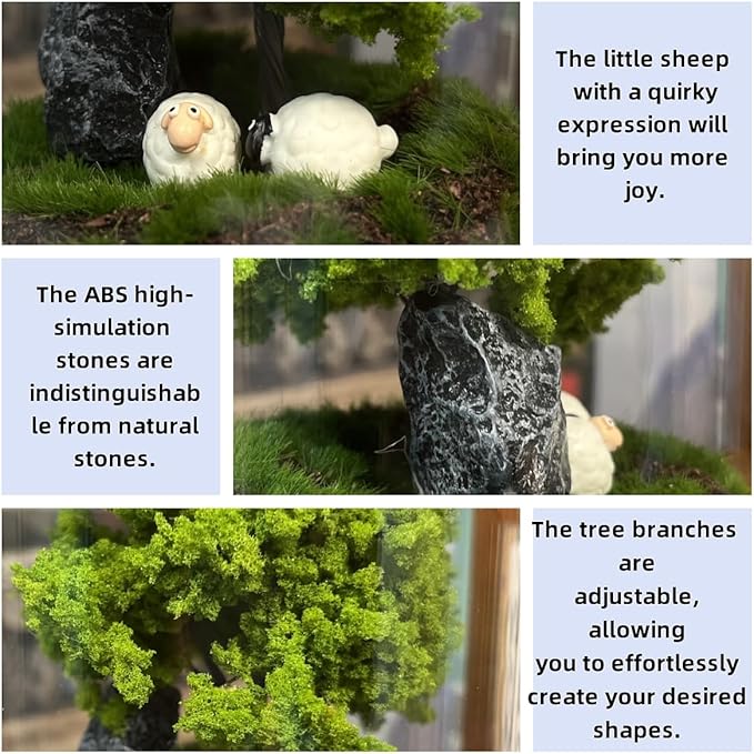 - Exquisitely Arranged, Lifelike: This mini plant landscape features a clever layout with a realistic tree, lush lawn, assorted stones, and a quirky lamb. Meticulously coordinated, it vividly mirrors nature, a mini fairy-tale forest adding unique charm to your space.