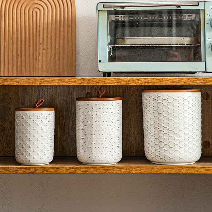 - Larger Capacities for Bulk Storage - Ideal for households that need more space, this set includes three larger white ceramic canisters (30 oz, 48 oz, and 82 oz). Use them to store oats, flour, cereal, rice, and other dry goods in generous amounts—perfect for family kitchens or bulk storage needs.