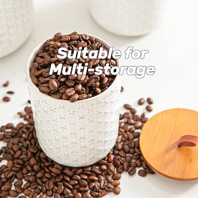 - Airtight Seal with Embossed Elegance - Made from durable white ceramic with embossed surfaces and bamboo lids, each jar includes a silicone ring that helps seal in freshness while keeping out air and moisture—preserving both taste and texture.