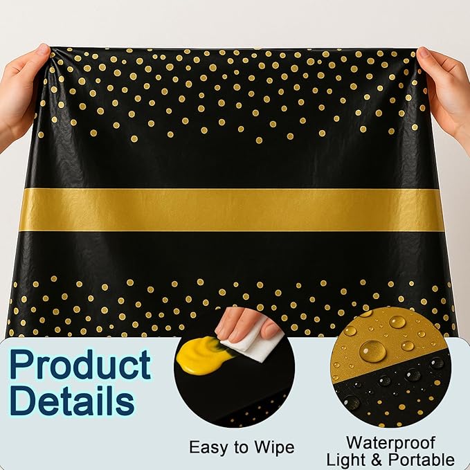 - Fashionable Metallic Design: These disposable tablecloths feature a sophisticated black background adorned with shimmering gold speckles. The stylish black-and-gold pattern instantly elevates your tablescape, creating a polished yet welcoming atmosphere that will make your gatherings truly unforgettable for family and friends.