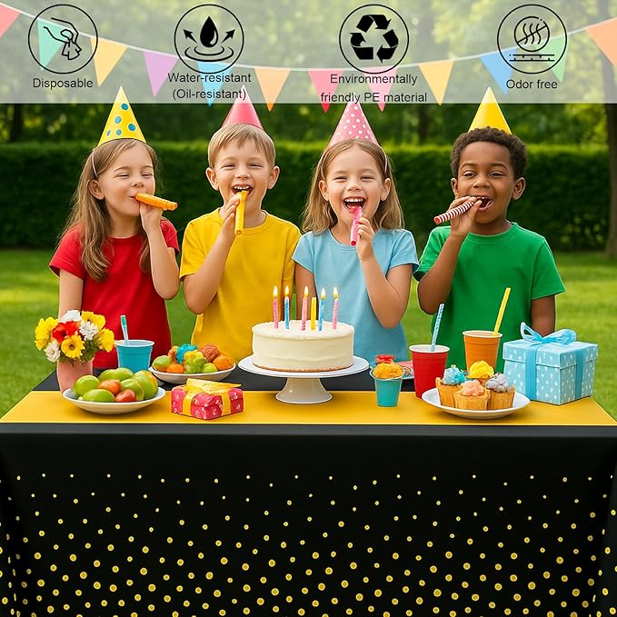 - Black & Gold Tablecloth Set: Your package includes 3 premium plastic table covers measuring 54" x 108" - ample size for standard 8-foot tables. These stunning gold-and-black disposable covers serve as ideal graduation party decorations for 2025, while also being perfect for baby showers, birthday celebrations, holiday gatherings, gender reveal parties, and other special events.