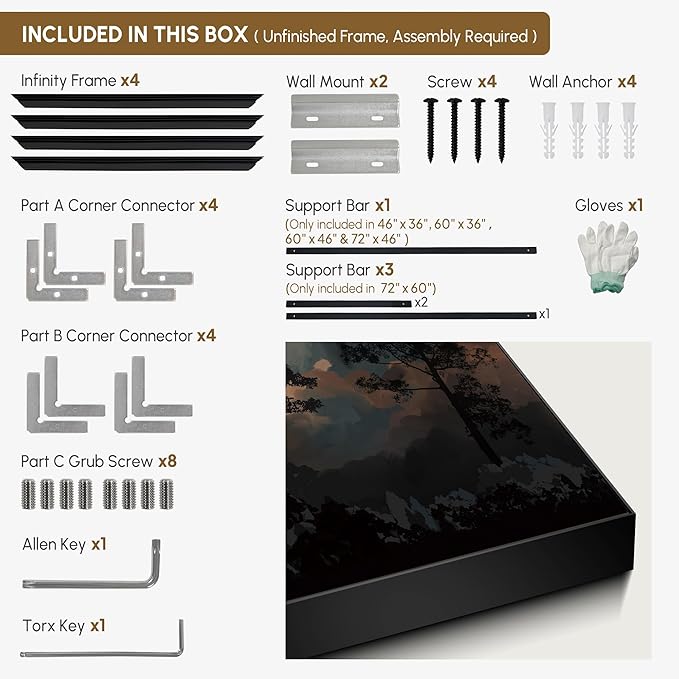 - Assembly Required: The artwork comes with the frame components unassembled. Don¡¯t worry ¡ª setup is straightforward and tool-friendly. For best results and accurate alignment, we recommend two people to ensure a smooth assembly and a stable, secure wall mount.