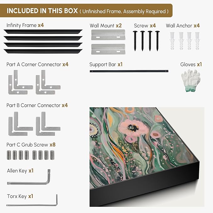 - Assembly Required: The artwork comes with the frame components unassembled. Don’t worry — setup is straightforward and tool-friendly. For best results and accurate alignment, we recommend two people to ensure a smooth assembly and a stable, secure wall mount.