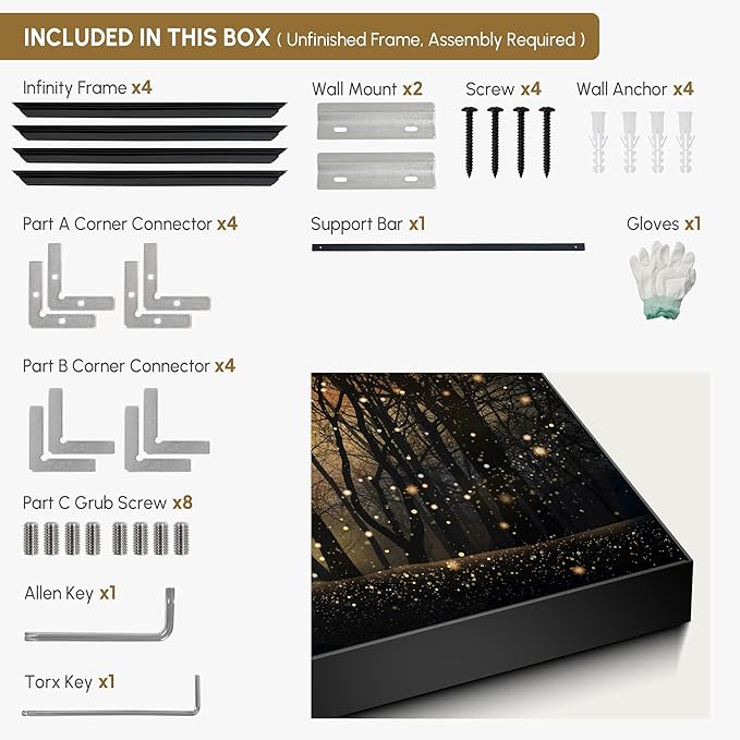 - Assembly Required: The artwork comes with the frame components unassembled. Don’t worry — setup is straightforward and tool-friendly. For best results and accurate alignment, we recommend two people to ensure a smooth assembly and a stable, secure wall mount.