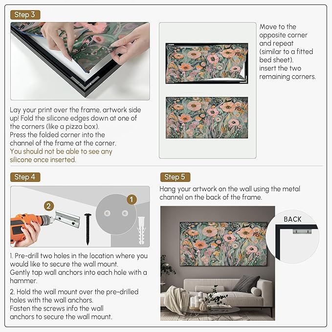 - Assembly Required: The artwork comes with the frame components unassembled. Don’t worry — setup is straightforward and tool-friendly. For best results and accurate alignment, we recommend two people to ensure a smooth assembly and a stable, secure wall mount.