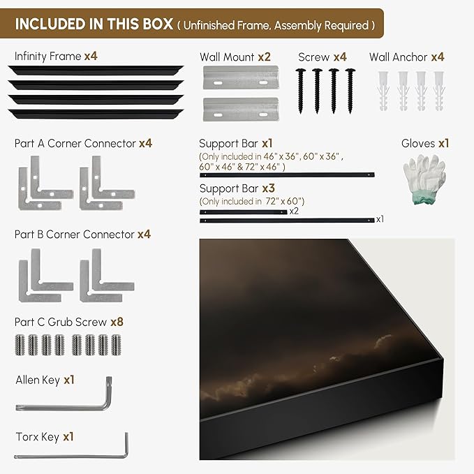 - Assembly Required: The artwork comes with the frame components unassembled. Don¡¯t worry ¡ª setup is straightforward and tool-friendly. For best results and accurate alignment, we recommend two people to ensure a smooth assembly and a stable, secure wall mount.